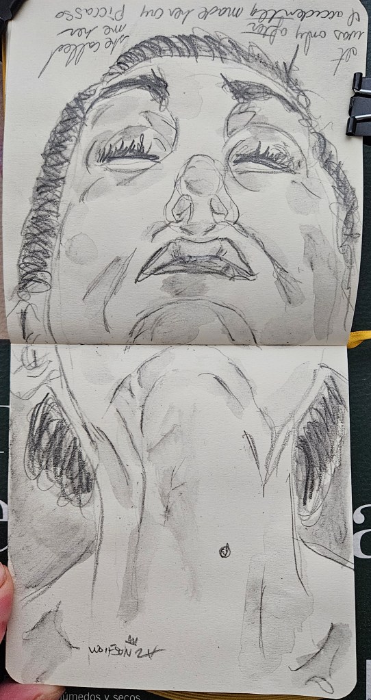 I had a little bit of paint left in my palette. I also had few of a different style I had bought while doing residency in Paris. These have a different style of pigment and look to them. I decided to do a loose experiment. Unfortunately, I grabbed the wrong pad of paper. I have a tabouret drawer for every style I use. Some are for different mediums but look the same unless you take a beat and read cover. I meant to use multi-medium paper which can be used with watercolors and other wet mediums.