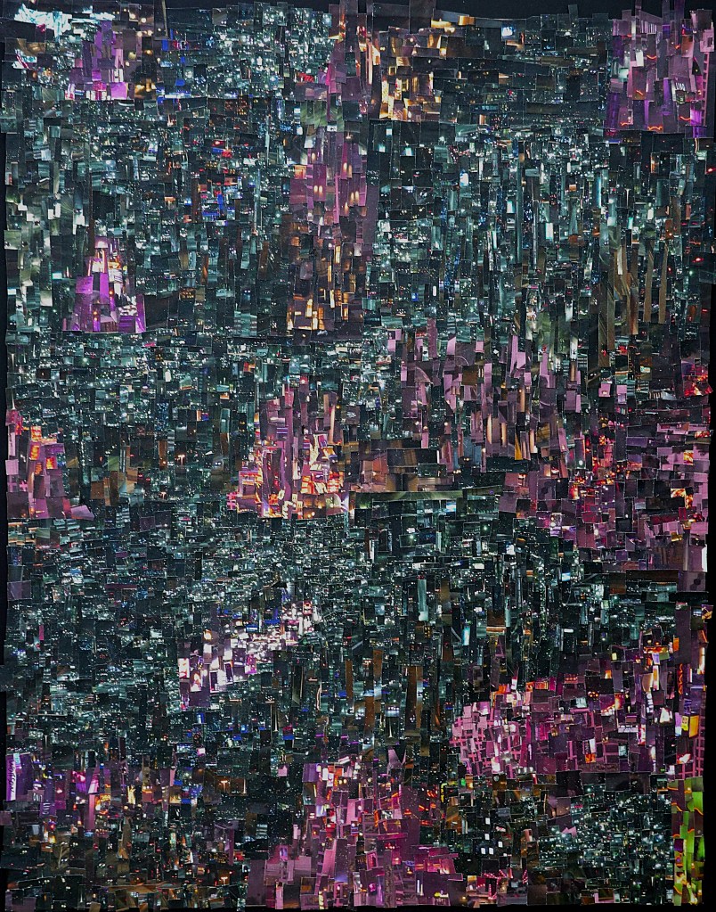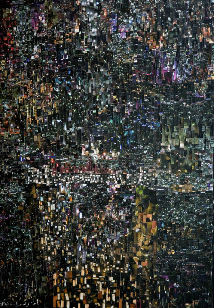 I cut up the photos into tiny, tiny pieces and they are carefully lain out on sheets. I look at the sheets as I work selecting what goes where in that moment. Do not ask me how i know, I just feel it, each selected piece seems right for where it is placed. The entire thing is very labor intensive, i see tiny paper snow flurries in my dreams often when halfway through a piece.