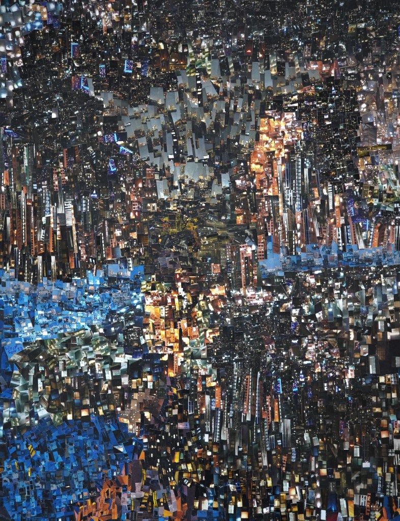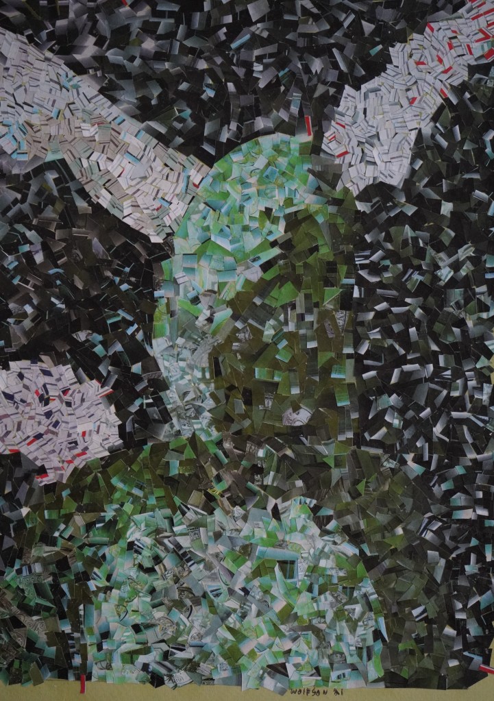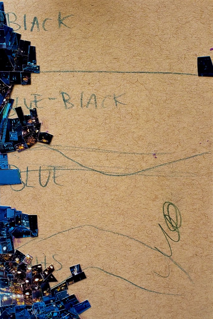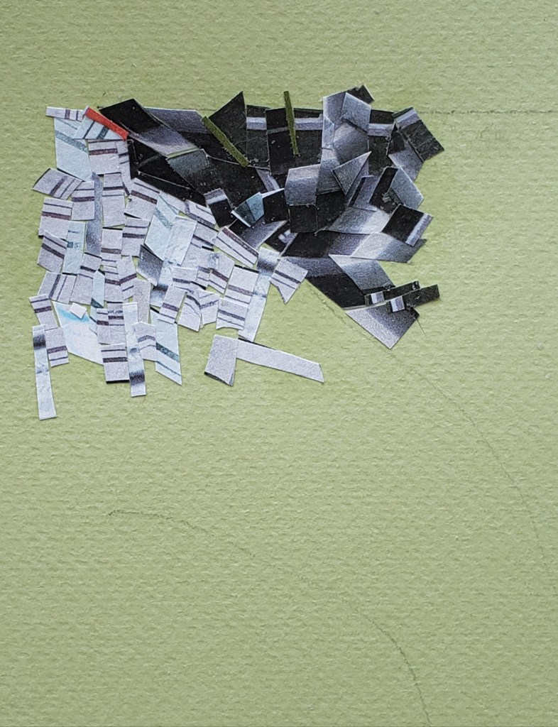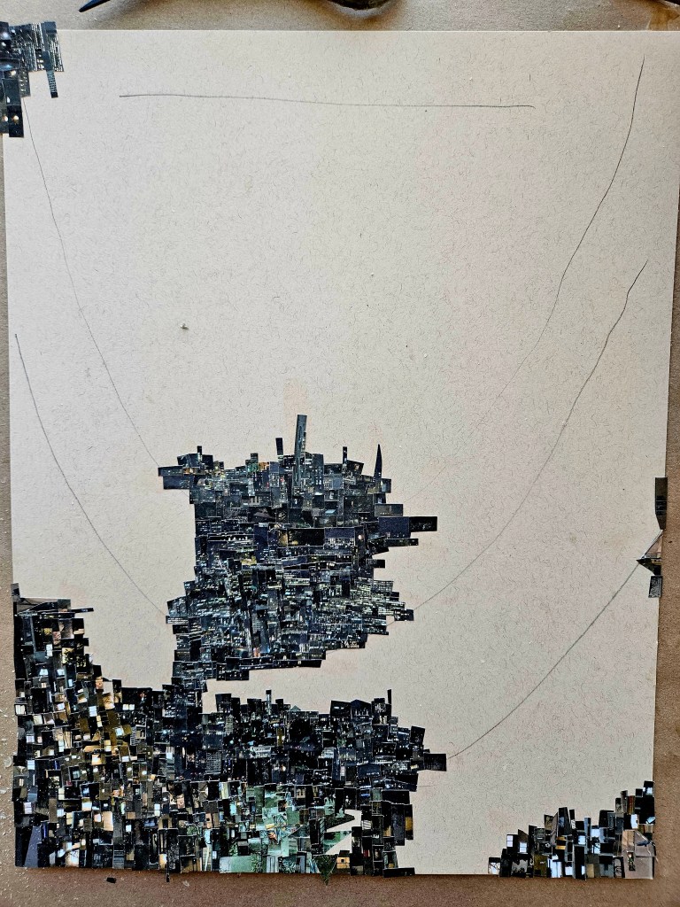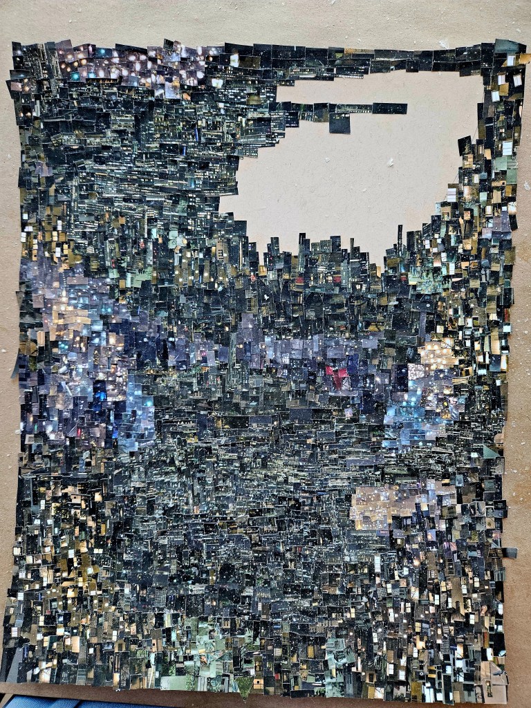 I cut up the photos into tiny, tiny pieces and they are carefully lain out on sheets. I look at the sheets as I work selecting what goes where in that moment. Do not ask me how i know, I just feel it, each selected piece seems right for where it is placed. The entire thing is very labor intensive, i see tiny paper snow flurries in my dreams often when halfway through a piece.