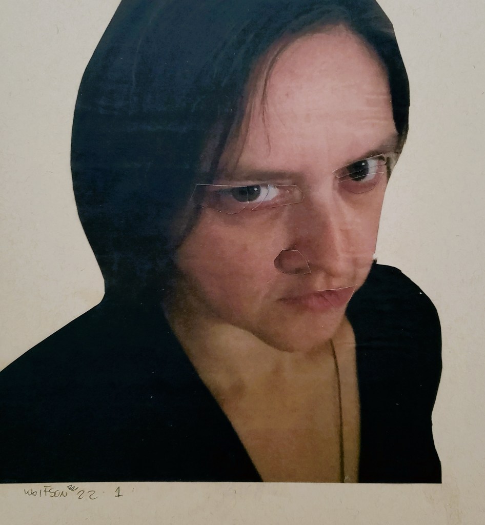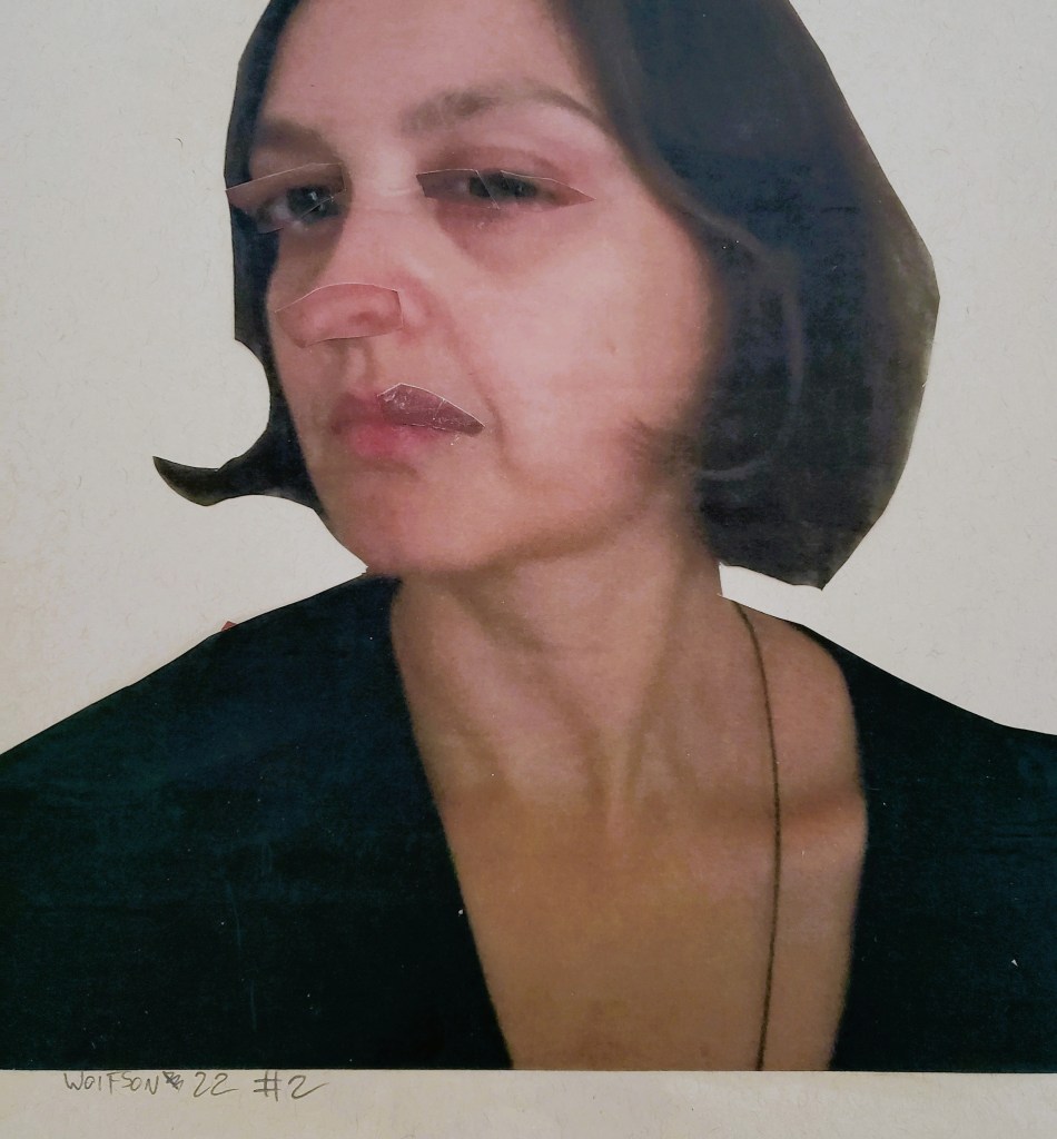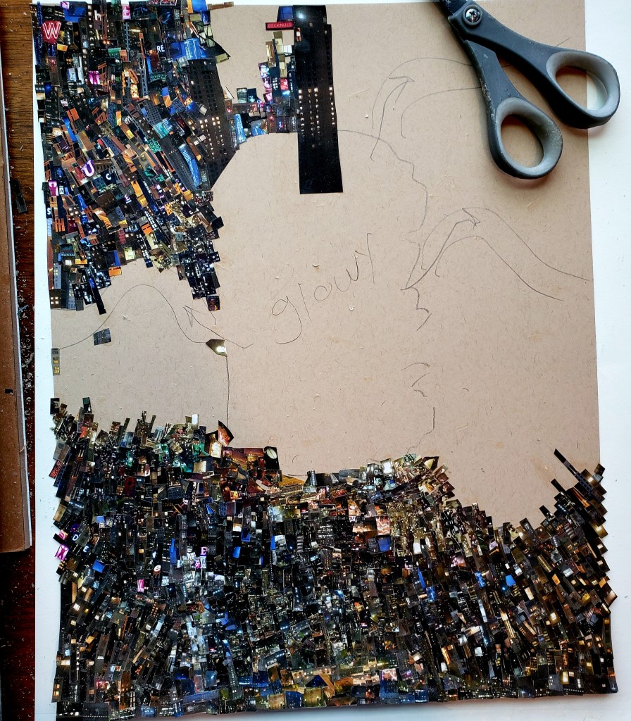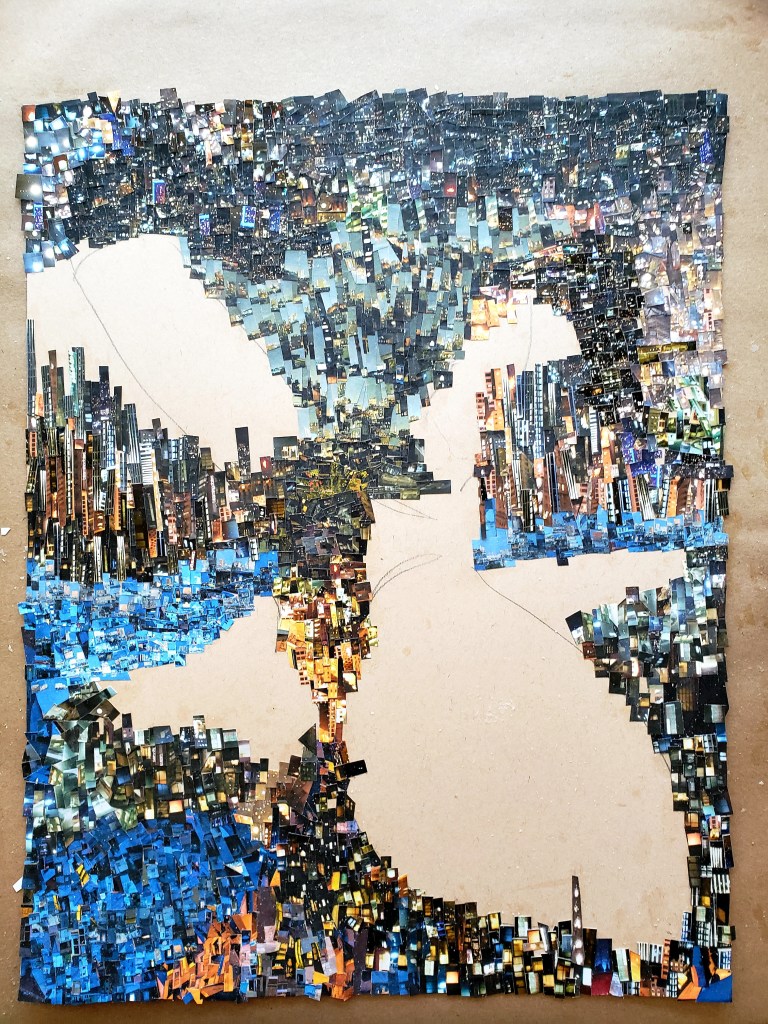 Each piece is comprised of one or two photos which I personally took. There is no digital magic, I use the old school method of my trusty tiny scissors and adhesive applied with brush on an 11×17 inch piece of heavy paper.